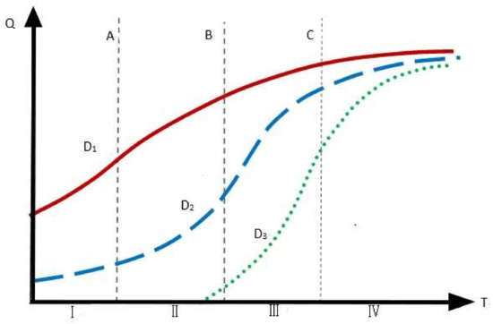 In Figure 2, the inflexion in the middle of the S Curve is the turning point in terms of the growth rate from fast to slow. We assume that the inflexions in the three demand curves D1, D2, and D3 correspond to lines A, B, and C, respectively. Demand for water resources can then be divided into four stages according to the locations of lines A, B, and C; demand is also closely related to economic development in the four stages (I–IV in Figure 2 and explained below). This situation reflects Gu’s [30] description of water development at different stages, i.e., the stages of development are normally connected to the level of socioeconomic and scientific as well as technological development.