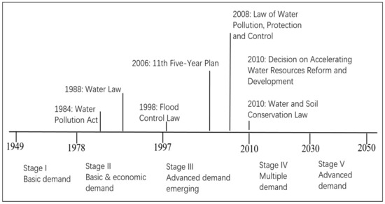 In this paper, we discuss the division in China’s water resources management stages from 1949 to 2050. This is informed by the framework of water demand and income categories from the World Bank, income being a major indicator for the division of stages of water resources management [25]. With the continuous economic growth in China, social structures and related demand structures have changed dramatically, significantly influencing water development. From 1949 to now, water resources management in China has changed from a basic demand-focused stage to a stage where basic, economic, and advanced demands coexist. Advanced demand is considered the key demand in the future management of water resources [34,35]. China faces advanced demand with a transformation of its economy from medium income to high income from 2011 to 2030, and a further developed economy and prosperity from 2031 to 2050 with growing demand for sustainable access of water resources. These several socioeconomic-development stages and the policy and legal instruments for more comprehensive water resources management in the country are discussed in detail below. A timeline is presented in Figure 3.