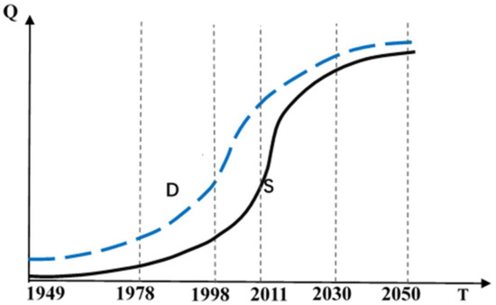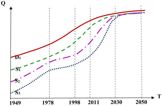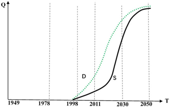 Economic demand is shown in the Figure 5 (the demand curve of D2 in Figure 2). It is apparent that since the economic reform in the 1980s, economic demand has risen sharply, and the gap between supply (S) and economic demand (D) has widened. However, due to the emphasis on water-saving activities by society in recent years, the gap is narrowing, and, according to the economic view, supply and demand will be balanced by 2030 [37,56]. Advanced demand is represented by the demand curve of D in Figure 2, where the time difference between advanced demand and the other two types of demand is highlighted. Basic and economic demand are developed in Stage I, and advanced demand emerges at the end of Stage II around 1998 in China, stimulated by socioeconomic development [37].