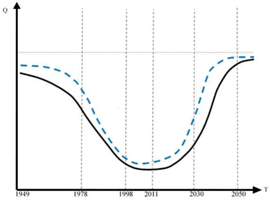 Furthermore, concerning how the changing patterns of basic, economic and advanced demand impact on water ecology and environment, the transition of water ecological environment (Figure 7) indicates the changing situation of water environment (solid curve) and water ecology (dashed curve) from 1949 to 2050.