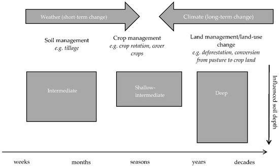 The need for sustainable intensification of agriculture to feed our growing population against the backdrop of climate change has led to worldwide attention on agricultural management practices (AMP) that are adaptive towards these challenges. AMP can denote multiple measures such as tillage, fertilization, plantation, fallows, etc. Such practices are often not separate but are part of the broad spectrum of sustainable land-management practices [1]. Although AMP are applied as instantaneous interventions, their effects on soil structure are active over various time scales (Figure 1, [2]). On long-term scales (years to decades), land-use changes such as deforestation or conversion from pasture to cropland result in long-term adaptation of soil structure [3,4,5,6]. On the other hand, tillage is the most analyzed AMP and, along with crop management (e.g., cover crops, crop rotation), affects the soil structure on a seasonal scale [6,7,8]. As a consequence, how much water infiltrates, evaporates, or leaks depends not only on the climate and vegetation but also on the geometry of the soil pore space, pore size distribution (PoSD), and soil structure.