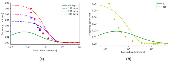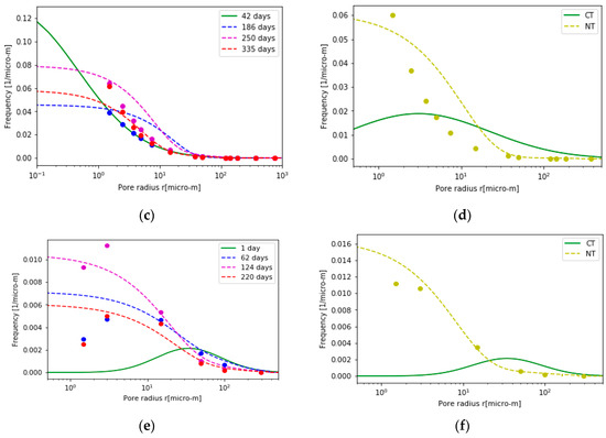 Evolution of soil pore size distribution (a) Fuentes et al. [89]: Post CT through a season for 0–3 cm depth. (b) Fuentes et al. [89]: Change in tillage regime from CT to NT for 0–3 cm depth. (c) Fuentes et al. [89]: Post CT through a season for 3–6 cm depth) Fuentes et al. [89]: Change in tillage regime from CT to NT for 3–6 cm depth. For (a,c), the blue, pink and red dots represent the frequencies for 186, 250 and 335 days after tillage while the dashed lines of the same color show the corresponding predicted frequencies. For (b,d), the lime-yellow dots and dashed line represents the observed and predicted frequencies for NT. In both graphs, the green line shows the initial PoSD following CT (in this case, 42 days when the first measurement was taken). (e) Peña-Sancho et al. [42]: Post CT through a season for 10–20 cm depth. The blue, pink and red dots represent the frequencies for 62, 124 and 220 days after tillage while the dashed lines of the same color show the corresponding predicted frequencies. (f) Peña-Sancho et al. [42]: Change in tillage regime from CT to NT for 10–20 cm depth. The lime-yellow dots and dashed line represents the observed and predicted frequencies for NT. In both graphs, the green line shows the initial PoSD following CT (in this case, 1 day when the first measurement was taken).