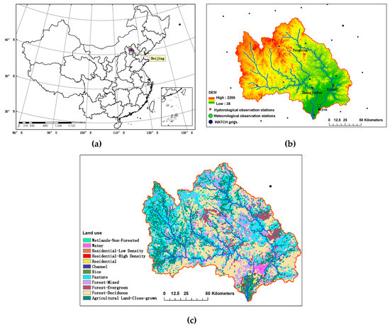 (a) Location of the CRB in China; (b) overview map of the CRB, DEM (shade), hydrological gauges (triangles), meteorological stations (green circles), and grid notes of climate forcing (black dots); and (c) the land use of the CRB.