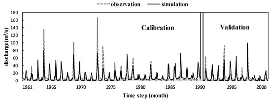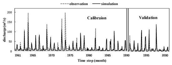 Monthly observed and simulated discharge at Xiahui station along Chao River.