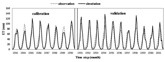 The monthly observed and simulated ET(Evapotranspiration) at CRB(Chaobai River Basin) during calibration and validation periods.