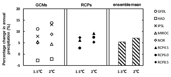 The SDs of annual mean precipitation among the whole ensemble are 6.9% and 7.1% for the 1.5 °C and 2.0 °C warming scenarios. The GCMs are still the main source of uncertainty with SDs among different GCMs 1.4 and 2.0 times larger than those among different RCPs for the 1.5 °C and 2.0 °C warming period, respectively.
