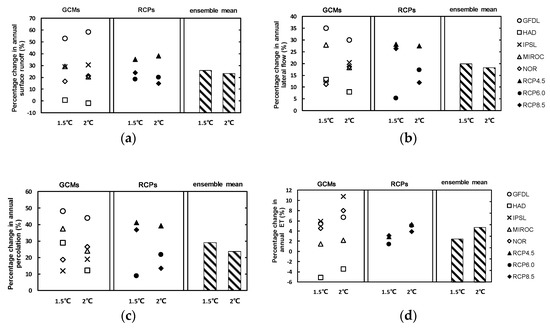 Percentage change in annual surface runoff (a), annual lateral flow (b), annual percolation (c), and annual ET (d) under 1.5 °C and 2 °C global warming in CRB.