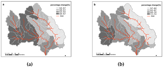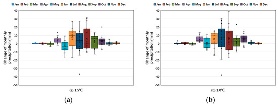 Change of monthly precipitation refer to baseline period (a) 1.5 °C; (b) 2.0 °C.