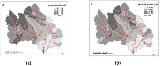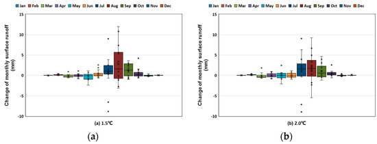 Change of monthly surface runoff refer to baseline period (a) 1.5 °C; (b) 2.0 °C.