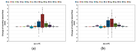 Change of monthly lateral flow refer to baseline period (a) 1.5 °C; (b) 2.0 °C.