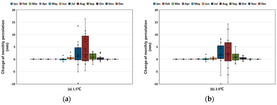 Change of monthly percolation refer to baseline period (a) 1.5 °C; (b) 2.0 °C.