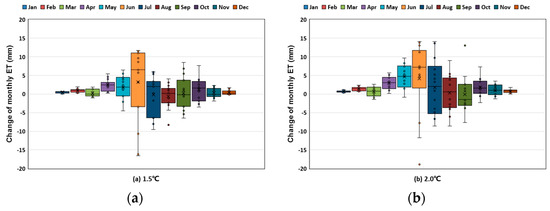 Change of monthly ET refer to baseline period (a) 1.5 °C; (b) 2.0 °C.