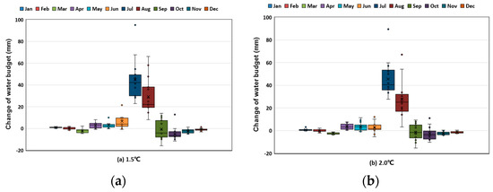 Monthly water budget under global warming scenarios (a) 1.5 °C; (b) 2.0 °C.