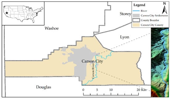 The southwestern United States not only experiences extreme heat but is also vulnerable to extreme flooding due to climate change []. Carson City, NV has had, since 1852, a historical record of flood, and is currently experiencing some flooding due to extreme storm events. Carson Valley, which lies 4700–5000 feet above the mean sea level, is the rain shadow of the Sierra Nevada. The highest point of the catchment lies on the Sierra Nevada, and is 11,462 feet above the mean sea level. The climate of the area ranges from semi-arid over the valley plain to humid or super humid over the peaks of the catchment. The catchment receives precipitation mostly as rain at the lower altitude and as snow at the higher altitude. Runoff reaches its yearly peak mainly in May. In this study, the downstream end of Carson River at Carson City is examined for future floods. The selected reach was flooded in 2007, and is susceptible to similar events in the future. The spatial location of the Carson River reach at Carson City selected for the current study is shown in Figure 1. Figure 1 also shows the digital elevation map (DEM) that represents the altitude along the river reach that was considered for hydraulic modeling.