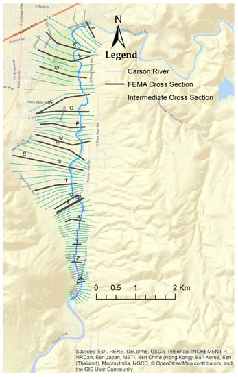 Carson River with the intermediate cross sections and the Federal Emergency Management Agency (FEMA) cross-sections. Sources: Esri, HERE, DeLorme, USGS, Intermap, INCREMENT P, NRCan, Esri Japan, METI, Esri China (Hong Kong), Esri Korea, Esri (Thailand), MapmyIndia, NGCC, ® OpenStreetMap contributors, and the GIS User Community.