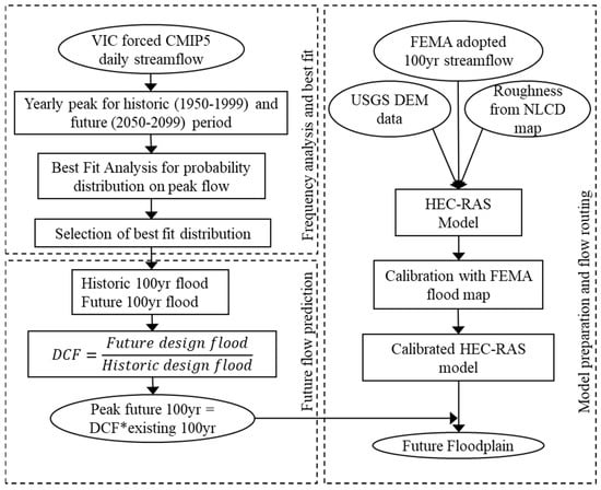 (iii) Flow routing: A HEC-RAS model was prepared from the available DEM model. Eighteen cross-sections from the Flood Insurance Rate Map (FIRM) and 58 intermediate cross-sections were prepared for the HEC-RAS model using ArcGIS (Version 10.4, Environmental Systems Research Institute (Esri), Redlands, CA, USA). A total of 76 cross-sections were assigned using the FIS-suggested Manning’s roughness coefficient. The existing 100-year return period’s flow (the design flow) was routed to the prepared model and compared with the existing FIRM map. Finally, the prepared model was routed to the future peak flood, and the hydraulic parameters were compared with the existing design condition of the FEMA map. The aforementioned steps involved in flow routing and flood plain delineation is summarized as the flowchart in Figure 3.