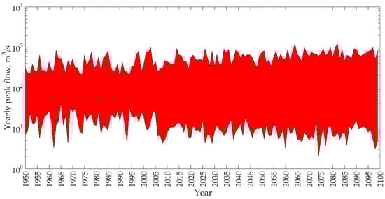 The daily streamflow series that was derived from the climate model projections shows a clear trend of an increasing future peak streamflow in Carson River and, at the same time, a decreasing yearly peak minimum, as shown in Figure 4. This signifies the occurrence of both more intense high flows and low flows as shown by the spread time series in Figure 4, which increases along the positive abscissa. The maximum and minimum yearly flow plotted in Figure 4 were obtained from 97 streamflow projections of 31 models and four RCPs. In this study, only the probable maximum flow was analyzed, as the study area is subject to a greater flood risk as a result of the high flows as compared to the low flows.