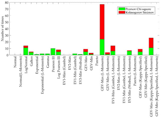 Yearly maximum streamflow data from the 97 climate projections from 1950 to 2099 were selected and analyzed using Pearson Chi-square and Kolmogorov–Smirnov tests. The best fit from both models is presented in Figure 5. The bars in Figure 5 represent the number of projections that was best-fitted with a specific distribution method from the two different tests. From Figure 5, GEV-Max (L-Moments) was selected as the best-fit distribution from the Pearson Chi-square and Kolmogorov–Smirnov tests, with a count of 24 and 53, respectively, out of 97 total projections. Thus, GEV-Max (L-moments) was found to be the best distribution method and selected to analyze future floods in the study area.