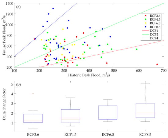 A comparison of the delta change factors from the 97 climate projections. (a) Historic versus future design flow (the peak flow over 100 years), (b) box plots comparing the delta change factor for different RCPs.