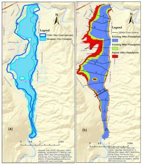 (a) A comparison of the Flood Insurance Rate Map (FIRM)’s 100-year flood area versus the baseline scenario (the 100-year flood area obtained from the HEC-RAS model). (b) The three layers of flood area for the 100-year historic, 500-year historic, and 100-year future floodplains (from a smaller to a larger area, respectively). Sources: Esri, HERE, DeLorme, USGS, Intermap, INCREMENT P, NRCan, Esri Japan, METI, Esri China (Hong Kong), Esri Korea, Esri (Thailand), MapmyIndia, NGCC, ® OpenStreetMap contributors, and the GIS User Community.