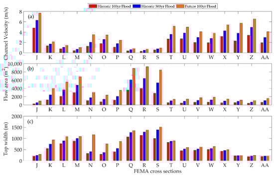 A comparison of the (a) channel velocity, (b) flow area, and (c) top width for different flood scenarios.