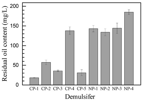 It has been reported that the adsorption of HPAM on the oil-water interface increases the steric barriers of dispersed oil droplets, which leads to the enhanced stability of oil/water emulsion [16,26,27,28]. Polymers (such as polystyrene sulfonate sodium, PSS) have the ability to form complexes with the oppositely charged molecules (such as hexadecanetrimethyl-ammonium bromide, CTAB) by electrostatic attraction or hydrophobic interaction [29,30]. In this study, the negatively charged HPAM might have formed complexes with the added demulsifier CP-1, which would deplete HPAM from the dispersed oil droplets surface [29,31]. Thus, the steric barriers between the dispersed oil droplets formed by HPAM were removed, which results in the weakening of the oil-water film on the dispersed oil droplets surface. On the other hand, it would be very difficult for the nonionic demulsifiers to form complexes with HPAM, which could explain the poor demulsification performance. The increased dilational elasticity transferred the adsorbed layer into a rigid and fragile one due to the film rupture, which also improved the coalescence ratio of the collision of dispersed oil droplets [32,33].
