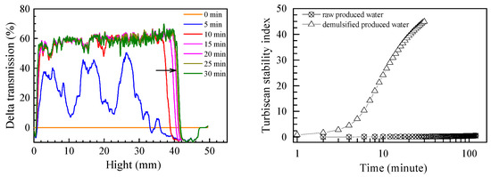 The whole demulsification process at a CP-1 dose of 300 mg/L was monitored by the multiple light scattering method, which is shown in Figure 5. The delta transmission light intensity of the treated PW showed many ups and downs, which suggests a coalescence of the dispersed crude oil droplets may have occurred. The transmission light intensity increased from the initial 0.2% to 60% within 10 min. At the same time, the turbiscan stability index (TSI) also sharply increased from 0.4 to 40.0 within 30 min, which indicates that the demulsification processes of the PW by CP-1 proceeded very quickly.