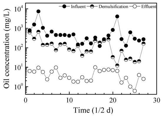 The pilot plant consists of demulsification, coagulation, sedimentation, and filtration compartments, which is shown in Figure 2. The effective volume for demulsification, coagulation, sedimentation, and filtration were 5.2, 1.6, 5.2, and 2.1 m3, respectively. PW was pumped into the system with a flow rate of 50 m3/d and 350 mg/L cationic demulsifier CP-1 and 500 mg/L PAC were added into the demulsification and coagulation compartments, respectively, under ambient temperature (14.0~22.0 °C). The field pilot study lasted for three months in the Xinjiang Oilfield in 2014.