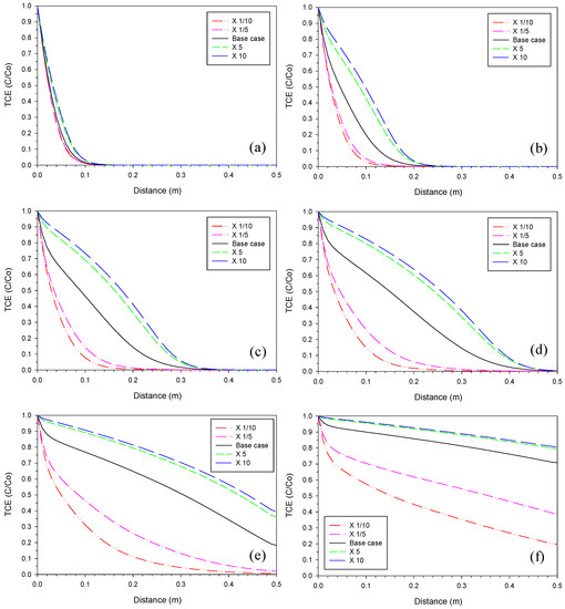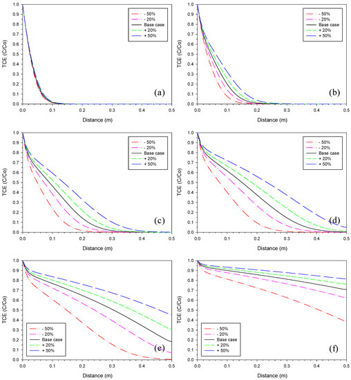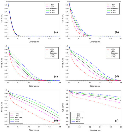 The range selected for the initial iron corrosion rate was +/−20%, +/−50% from the base case. The fitted iron corrosion rates were generally very close to the measured maximum iron corrosion rates [16]. Therefore, it was considered that the selected range for sensitivity analyses covers the possible changes induced by differences in the initial iron corrosion rate. Figure 1 shows the effect of the iron corrosion rate on the TCE profiles at different times. The deviations from the base case increased with time, approaching a maximum on Day 164. However, the effect leveled off at later times (Figure 1f) because of the exponential nature of the reactivity loss (Equation (2)).