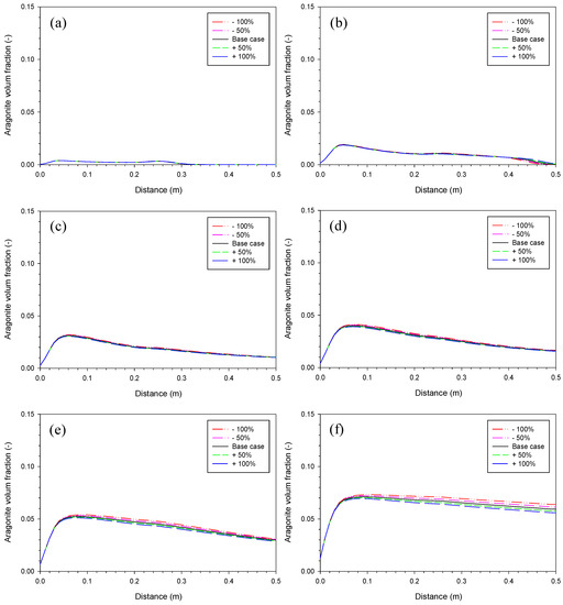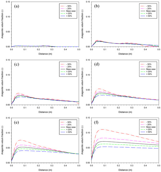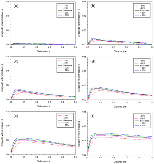 Sensitivity analysis of iron corrosion rate. Aragonite volume fraction on (a) Day 4, (b) Day 25, (c) Day 54, (d) Day 87, (e) Day 164, and (f) Day 410 with value of the base case, +/−20% and +/−50%.