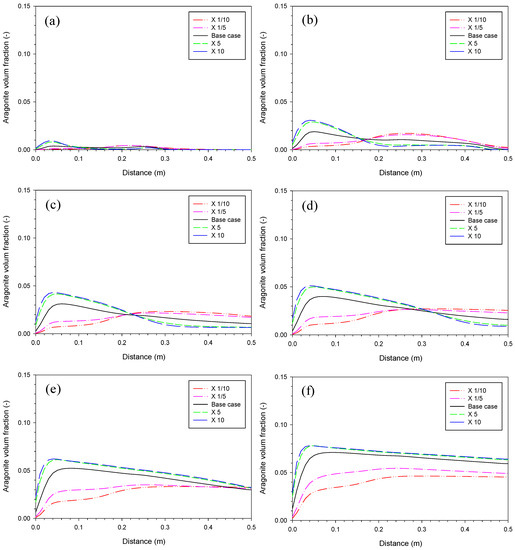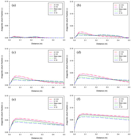 Sensitivity analysis of aragonite precipitation rate. Aragonite volume fraction on (a) Day 4, (b) Day 25, (c) Day 54, (d) Day 87, (e) Day 164, and (f) Day 410 with value of the base case, ×1/10, ×1/5, ×5, and ×10.