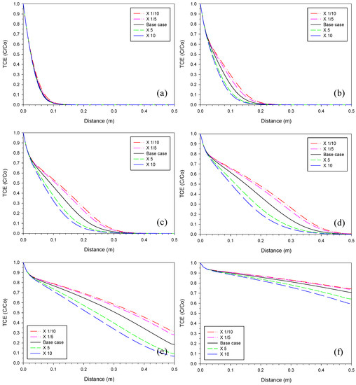 Sensitivity analysis of aragonite precipitation rate. TCE profiles on (a) Day 4, (b) Day 25, (c) Day 54, (d) Day 87, (e) Day 164, and (f) Day 410 with value of the base case, ×1/10, ×1/5, ×5, and ×10.