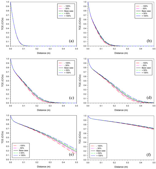 Sensitivity analysis of (proportionality constant for aragonite). TCE profiles on (a) Day 4, (b) Day 25, (c) Day 54, (d) Day 87, (e) Day 164, and (f) Day 410 with value of the base case, +/−20% and +/−50%.