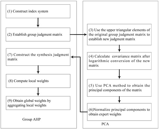 The expert weights obtained from PCA can be used to build the comprehensive judgment matrix. Correspondingly, the covariance matrix required by the PCA method can be obtained from the group judgment matrix of the group AHP method. After the synthesized group judgment matrix is constructed by combining a group decision matrix with expert weights, we can obtain the weight of each indicator by the solution of traditional AHP. The detailed process is explained in Figure 1, which includes the following 9 steps.