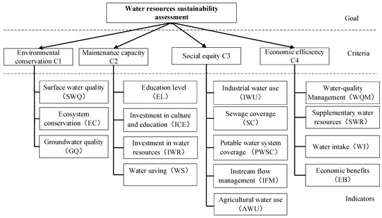 Many studies have been conducted in the assessment of water resources sustainability [6,7,8,9,10,11,12]. Koop et al. [6] proposed a critical review of a city blueprint approach to evaluate the sustainability of water resources management. Giacomoni and Berglund [7] carried out a case study to evaluate adaptive demand management for urban water resources sustainability by a complex adaptive modeling framework. Xu et al. [8] evaluated Yellow River Water resources with the water resources system dynamics model. Zeng et al. [9] studied the sustainable utilization of water resources under uncertain conditions by using the scenario-based stochastic optimization method based on the Laplace criterion. Peterson et al. [10] assessed sustainable water resources in Minnesota’s (USA) Twin Cities Metropolitan Area based on the watershed characteristics approach. Hernandez-Bedolla et al. [11] developed different indicators to assess the availability of water using an integrated water resources management approach. Ni et al. [12] performed four different scenarios to assess the water sustainability of Chongming Island. Although the aforementioned researchers assessed the sustainability of water resources from different viewpoints and methods, they did not explore this problem in a hierarchical way or provide the importance priorities of indices.