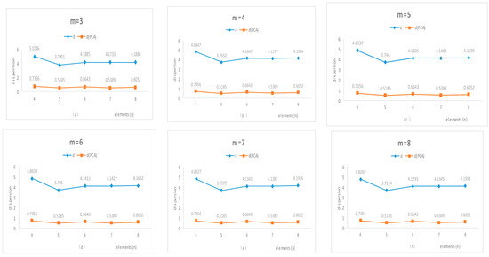 Under the first scenario, there are 3 experts who evaluate the 4 criteria, seen as Figure 3a and Table 9. First, it assumes that only one expert always makes the pairwise judgment of the element tuple from to , and we compute the dispersion of both methods by Equation (A6), respectively. In the same way, d and d(PCA) are recalculated to obtain a series of points when ranges from 4 to 8. In each round of simulation, the dispersion degree and the number of experts keep constant and only the element tuple produces dispersion. Through the simulation, we obtain two broken lines which represent the dispersion fluctuations made by both judgment matrices. We change the number of experts to do the same calculation in other rounds of the simulation, depicted in Figure 3b–f. As the results indicate, d(PCA) is obviously smaller than d, which has no business with n; thus, this shows that the dispersion of the judgment matrix addressed by group AHP-PCA is obviously reduced. When the number of experts is changed, the same result can be obtained from the broken line diagram.
