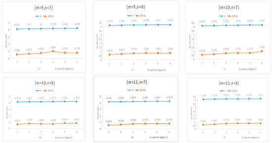 Under the second scenario, there are 9 experts who evaluate the 7 criteria (Figure 3), seen as Figure 4a and Table 10. First, this assumes that the pairwise judgment of the element tuple change from to which produces dispersion and = 1. By change the pairwise judgments of the element tuples, the dispersion degree ranges from 1 to 6 with fixed number of experts and elements, and we calculate the dispersions made by both methods. To further verify the results, the number of experts and elements are different in 6 rounds of simulation. In each round, we set the combination of the two parameters of m and n, depicted in Figure 4. In the case of the diversity of dispersion degrees, the dispersion of the group judgment matrix after PCA treatment is obviously reduced, which further proves our conclusion.