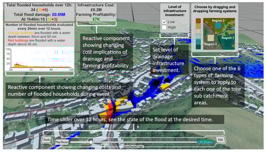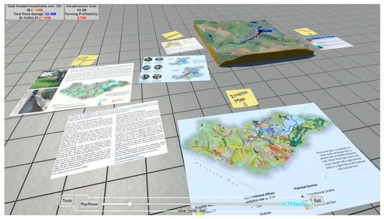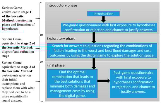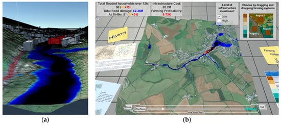Serious Games (games used for purposes other than mere entertainment), as an effective means of engaging stakeholders, have been previously used for water system planning and management [5,6] with common aims of raising awareness [7,8,9,10,11], facilitating dialogue [11,12,13,14,15,16], or training for crisis response [17,18]. The Serious Game presented in this work aims to fulfill the research action goal in three ways. First, the software developed introduces novel technical elements to make it an effective Virtual Reality tool for visualizing results of simulations of 3D animated floods—a category of the Serious Game visualization system that is missing from the present body of work [6]. While existing work tends to emphasize “step-based” 3D flood visualization [19,20,21,22,23], the tool developed in this work focuses on the real-time deformation of 3D meshes representing volumes of water, with animated shaders allowing the mapping of color gradients to the mesh surface in order to emphasize flood depth. Second, to the best of our knowledge, this is the very first time that a Serious Game combining hydraulic simulation results, expert knowledge about farming systems and soil science, drainage infrastructure management, as well as representative damage and cost estimates have been put together to help players find an efficient (and previously unexplored) solution to the flood resilience problem for a real-world case study. Finally we propose a novel Serious Game intervention design inspired by the Socratic Method [23] and aim to prove that it can (a) enable participants to use inductive reasoning based upon game-derived data (hydraulic and costs) to confirm or reject hypotheses in a rational manner, and (b) encourage the players to question their initial assumptions (perception of the truth) and assist them in shifting towards a more reasoned, scientifically sound, deductive solution, i.e., closer to the evidence (“scientific truth”).