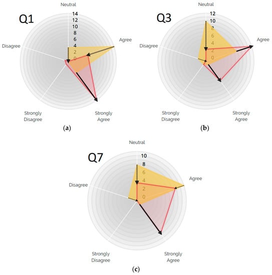 Radar charts showing for all participants, where the changes induced by the games for answers to hypothesis reflects a stronger agreement. Each participant answer (−2 = strongly disagree, −1 = disagree, 0 = neutral, 1 = agree, 2 = strongly agree) is rated on one axis in yellow (pre-game) and red (post-game) areas. The questions answered are (a) Q1; (b) Q3; (c) Q7.