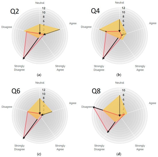 Radar charts showing for all participants, where the changes induced by the games for answers to hypothesis should reflect a stronger disagreement. Each participant answer (−2 = strongly disagree, −1 = disagree, 0 = neutral, 1 = agree, 2 = strongly agree) is rated on one axis in yellow (pre-game) and red (post-game) areas. The questions answered are (a) Q2; (b) Q4; (c) Q6; (d) Q8.