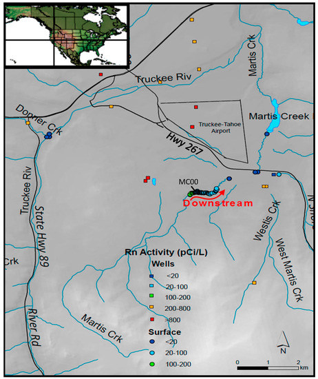 Initial surveys of 222Rn in well samples and stream samples distributed around Martis Valley showed uniformly high 222Rn activities in wells and mostly very low activities in streams (Table A1 and Table A2). Radon-222 activities in well samples had a mean value of 804 pCi/L. Such high activities are typical for groundwater in basins with sediments derived from granitic and volcanic rocks [41,42].