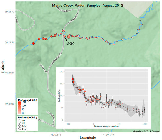 A final stream survey was performed in March/April 2013 (Figure A3 and Table A2), upstream from the August 2012 survey. No precipitation occurred in the preceding few days before sampling. Because of higher discharge from snowpack runoff, which tends to peak in late March or early April [43,44], 222Rn activities in the stream were lower; however, relatively high activities were observed near the same locations during runoff and baseflow seasons.