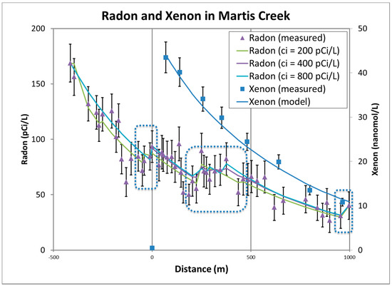 Measured 222Rn activities (purple triangles) and Xe concentrations (blue squares) in the study reach are shown along with the predicted model values for 222Rn for different values of the groundwater 222Rn concentration ci (purple, green, and blue lines) and Xe (blue line). Dashed rectangles highlight stretches of Martis Creek where groundwater inflow is detected. Distance 0 shows the tracer introduction location (MC00 in Table 1), distance 500 m is the approximate location of MC23 and distance 1000 m is the approximate location of MC34 (Table 1).