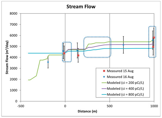 The modeled cumulative stream flow increases from 4380 m3/day at the injection location to 5175 m3/day at a distance 1 km downstream (Figure 4). The calculated influx of groundwater is equivalent to 18% of the initial stream flow if a groundwater 222Rn concentration of 400 pCi/L is assumed. Lower (200 pCi/L) or higher (800 pCi/L) groundwater 222Rn concentrations result in higher (28%) or lower (11%) influxes of groundwater, respectively. Although the calculated groundwater influx values in this reach (800 m3/day) are within the uncertainty ranges of the stream flow measurements made at various locations on August 15 and 16, the influx represents a critical portion of the annual discharge, as the importance of the persistence of the influx into the late summer and fall cannot be overstated. The presence of deep pools that act as refugia for fish and the moderating effect of groundwater discharge on temperature are recognized as controls on species distribution and total biomass [6,7,8,9,10].