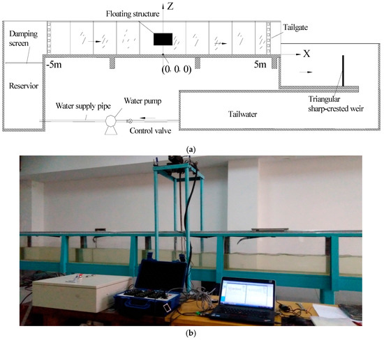 The experiments were conducted in a flume at the Hydraulic Laboratory, Hohai University. The dimensions of the flume were 10.00 m, 0.30 m, and 0.50 m (length, width, and height, respectively) and the slope of the flume was 0. The device used for the experiment has a self-circulation system, composed of a water pump, control valve, damping screen, glass flume, tailgate, triangular sharp-crested weir and tail water; Figure 1a shows the layout of the experimental rig. A damping screen was installed at the upstream of the flume to calm the flow; the testing area of the floating structure was in the center of the flume. Experiments were conducted under submerged flow flows. Floating structures in different positions were fixed with the side walls of flume, with their width perpendicular to the flume. The water flows through the upper and lower parts of structures into the downstream and cannot flow around it. The tailgate at the end was used to regulate downstream water depth. The water supply to the flume was provided through a supply pipe from the pump, with flow control provided by a valve. A triangular sharp-crested weir at the end of the flume displayed the discharge. The water depth was measured using a point gauge to an accuracy of ±0.01 cm, level measurements were taken at a distance of 2 m from the center of the structure, and typical velocities were obtained by particle image velocimetry (PIV). Flow characteristics around the floating structure were measured along the longitudinal section. The overturning moment of the structures caused by the surface hydrodynamic pressure in current was measured and analyzed.