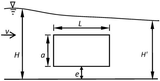 During the operation of floating structures in current, factors affecting overturning moment mainly include the floating structures’ shape, the vertical position and the hydraulic conditions. According to the factors affecting the overturning moment in hydraulic engineering, the indoor experiments were established and the main parameters conditions were analyzed. The experiments were conducted with the width B = 30 cm of the floating structure perpendicular with the flume, and the structure height was a = 10 cm. The unit inflow discharges were q = 0.05, 0.06, 0.07 and 0.08 m2/s. To study the effect of structure size, four lengths were used, namely, L = 10, 20, 30 and 40 cm, in the flow direction. Four flow cases with the water level difference ΔH = 1, 2, 3 and 4 cm were tested, ΔH = H − H’, where H and H’ are the upstream and downstream water depths, respectively. Floating structures were set at four vertical positions at depths of submergence of e = 2, 5, 10 and 20 cm. The opening (or gap) e beneath the structure was defined as the distance from its lower edge to the flume bottom; v denoted the velocity. The hydrodynamics parameters are illustrated in Figure 2 and experimental parameters are showed in Table 1.