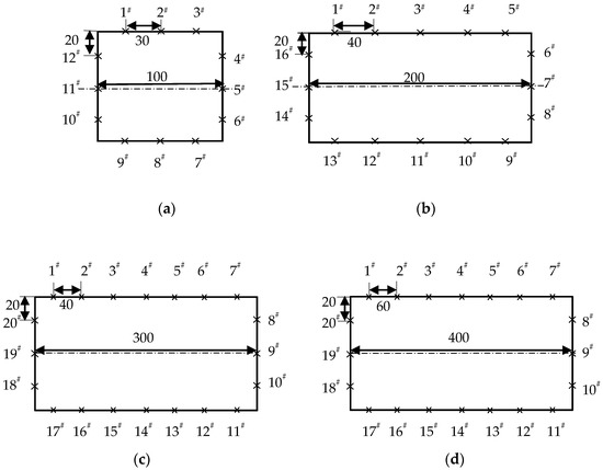 Layout of pressure measurement points: (a) 100 × 100; (b) 200 × 100; (c) 300 × 100; (d) 400 × 100 (mm).