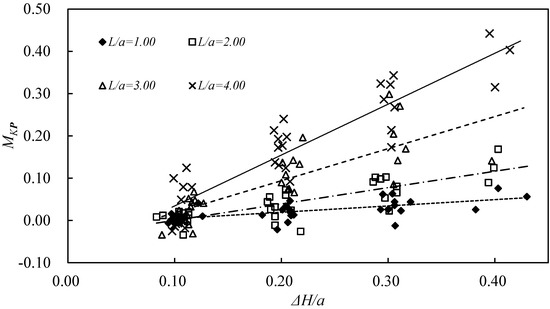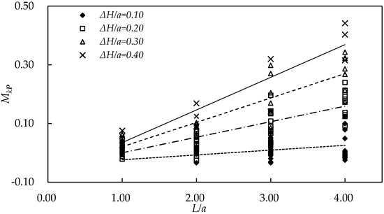 The effect of the shape ratio of the floating structure L/a on MKP under ΔH/a = 0.10, 0.20, 0.30 and 0.40 is shown in Figure 5. The behavior, particularly the size and position, is directly related to the overturning moment. The scattered points indicate that under the same ΔH/a, MKP increases significantly with increasing L/a. The values of MKP corresponding to L/a = 4 are comparatively larger than that of L/a = 1, 2 and 3. Note that the gradient of growth presents an increasing trend if ΔH/a is large. The structures’ shape increases, resulting in larger surface area under the effect of hydrodynamic pressure and bigger distance to the center point of structures. The higher water level difference results in the higher value of pressure difference. Therefore, the value of MKP is larger and stability is decrease. The relationship between MKP and L/a is linear, and its gradient changes under different ΔH/a. The relationship between MKP and L/a, ΔH/a is resulted from the variations of hydrodynamics characteristics under different L and ΔH, which are described as follows. During the experiment, with increasing L/a, the flow velocity decreases significantly near the structures’ top center. A small recirculation region near the top of the structure expands to the back half of the structure; the minimum pressure value is on the center of the top surface. Larger ratios result in lower pressure on the upper and lower surfaces, and the pressure distribution on the surface is significantly uneven. For a relatively high ratio, the pressure drop is large from the entrance of the bottom gap to the downstream part, causing the increasing pressure difference and giving rise to the overturning moment. Although the larger L partially improves the discharge capacity, the effects of vibration and pressure difference may threaten the safety of the structure. Therefore, it is advisable to increase the safety of the structure by reducing its shape ratio.