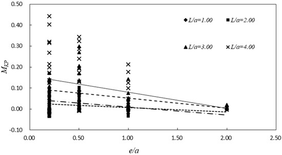 In Figure 6, MKP is plotted against e/a for different values of L/a. The range of MKP shows a decreasing trend with growing e/a in all cases. With increasing e/a, the MKP decreases under the same shape of floating structures. In the same vertical position, larger ratios L/a result in the higher gradient of growth, and this is agreement with the previous conclusion. Hydraulic pressure causes the change of overturning moments in different positions. The hydrodynamic pressure acting on the surface of structures decreases obviously if the floating structure floating upward. For a submerged structure, the hydrostatic pressure results in the pressure distribution and accounts for a large proportion of the total pressure. The distance between the structure’s upper edge and the water surface decreases, leading to lower pressure on the surface. Lower pressure reduces the pressure difference, which is an essential cause to reduce MKP. The effect of e/a on MKP is different under the influence of L/a. The relationship between MKP and e/a is linear; its gradient of growth changes under different L/a and presents a linear relationship between them. It is also found that there is the linear relationship between the MKP and e/a and L/a, which is obtained as follows: