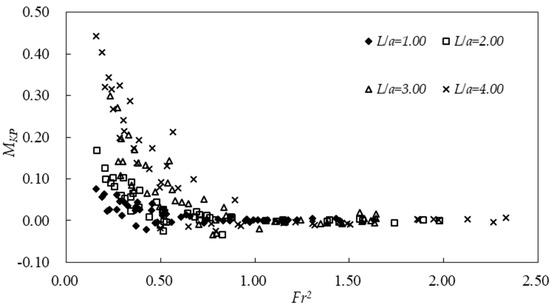 In Figure 7, the experimental data of MKP are plotted versus Fr2 for L/a = 1.00, 2.00, 3.00 and 4.00. The change of the overturning moment is not prominent until Fr2 reaches 1.00, which is defined as the critical Froude number of the overturning moment. In the range Fr2 < 1.00, L/a influences MKP. The higher shape ratio results in the higher value of MKP and the gradient, in agreement with the previous conclusion. The scattered points indicate that under the same ratio of floating structures, MKP increases significantly with decreasing Fr2. If Fr2 > 1.00, then the range of MKP becomes close to a straight line, i.e., L/a has no significant effect on MKP if Fr2 reaches and exceeds 1.00. Note that the distribution of MKP is wider as L/a grows if Fr2 is small. MKP and Fr2 exhibit a nonlinear relationship in all cases. With an increasing velocity, the velocity difference between the upstream and downstream face of the structure becomes larger. Due to the throttling effect of the floating structure, the water level between the upstream and downstream regions increases, leading to an increasing overturning moment and decreasing of its stability. In actual situations, if Fr2 is lower than its critical value, it has a significant impact on the stability behavior.